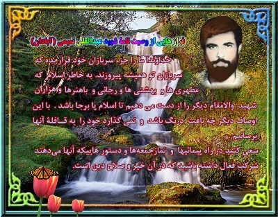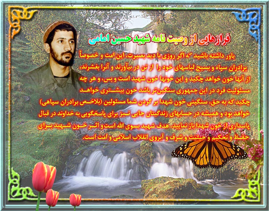 باور داشته باشید که اگر روزی با دید بصیرت ، این امت و خصوصا برادران سپاه و بسیچ لباس های خود را از تن در بیاورند و آنرا بفشارند، از آنها خون خواهد چکید و این خونها خون شهید و بس . و هرچه مسوولیت فرد در این جمهوری سنگین تر باشد خون بیشتری خواهد چکید که به حق سنگینی خون شهدا بر گردن شما مسوولین (بالاخص برادران سپاهی ) خواهد بود و همیشه در حساب های زندگیتان جایی نیز برای پاسخگویی به خداوند در قبال پاسداری از خون شهدا باز نمایید.
