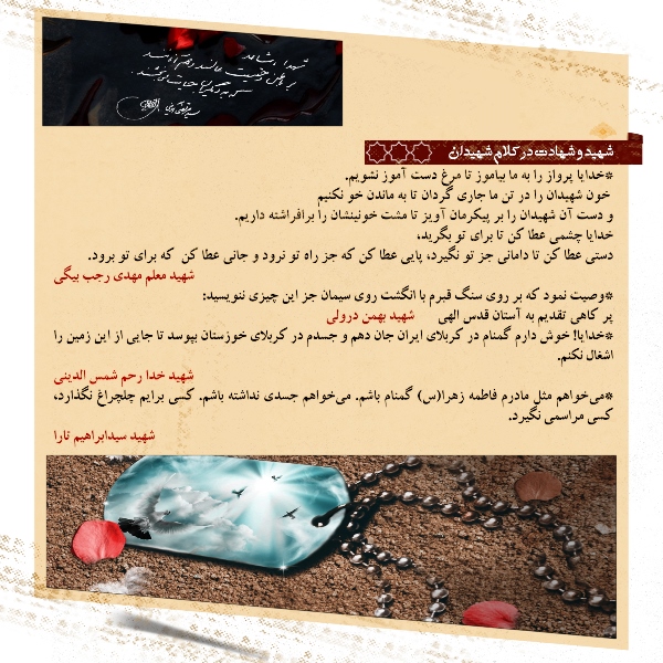برادر و خواهرانم! من شما را به خون خود قسم می دهم که در راه خدا بیشتر گام بردارید و از شما میخواهم همچون زینب سلام الله علیه دنباله رو حسین علیه السلام باشید. دوستان عزیزم از شما میخواهم که در راه خدا گام برداشته و در راه اسلام از فدا کردن جان خود دریغ نکنید من شما را شفاعت میکنم.